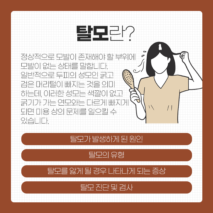 그리고 탈모에 대해 말해보자면 모발이 정상적으로 존재해야 하는 부위에 모발이 없는 것을 말하는데요. 일반적으로 두피에는 성모와 연모가 있습니다. 이 중에서 성모는 굵고 검은 머리털을 이야기하고, 연모는 색깔이 없고 굵기가 가는 머리털을 이야기하는데요. 여기서 성모가 빠지게 되면 미용상 문제를 일으킬 수 있답니다.