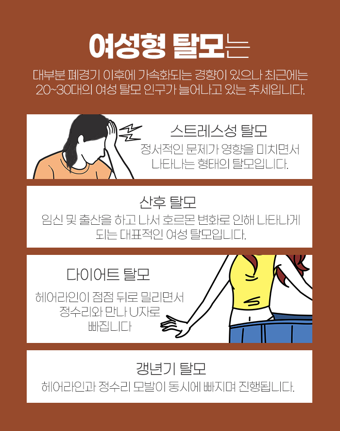 이러한 여성형 탈모는 스트레스성 탈모와 산후탈모, 다이어트 탈모, 갱년기 탈모가 있는데요. 스트레스성 탈모는 정서적인 문제가 영향을 미치게 되면서 나타나게 되는 것을 말하고, 산후 탈모는 임신 및 출산을 하고 나서 호르몬 변화로 인해 나타나게 되는 것을 말합니다.