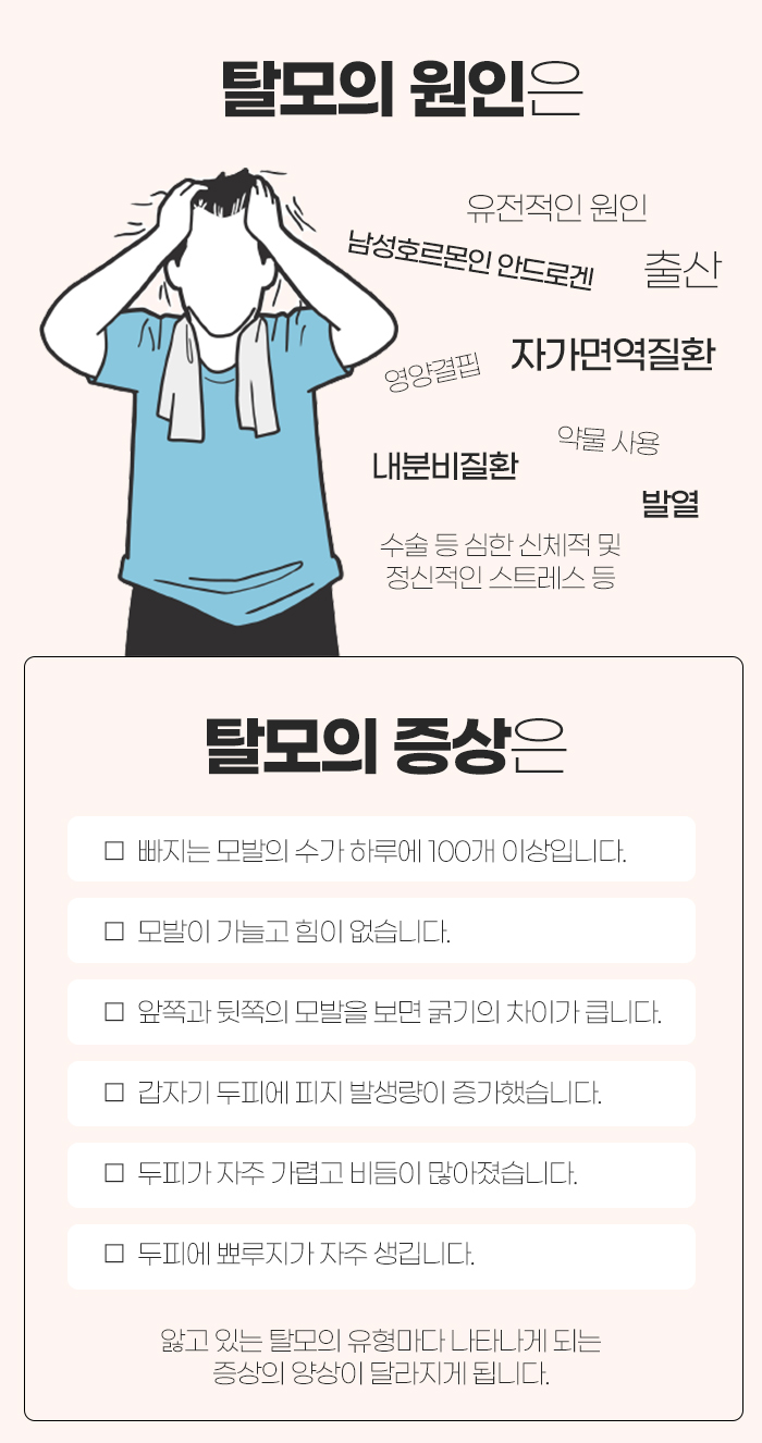 그리고 이러한 탈모는 유전적인 원인과 남성 호르몬인 안드로겐의 영향으로 인해, 출산으로 인해, 영양 결핍으로 인해, 자가면역질환이나 내분비질환으로 인해, 약물 사용에 따른 부작용으로 인해, 열이 오르면서, 수술 등 심한 신체적 및 정신적인 스트레스 등으로 인해 발생하게 되는데요.