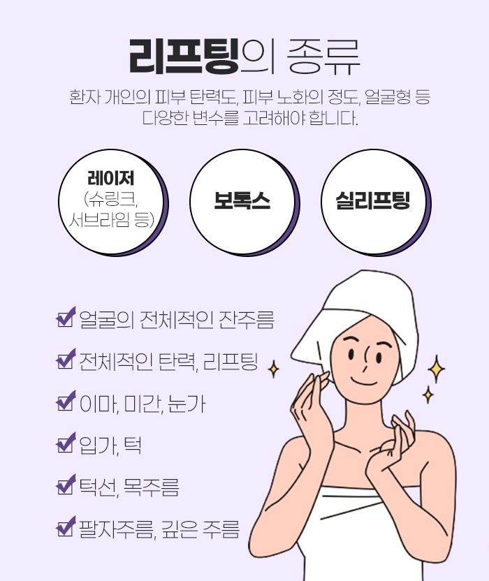 하지만 환자분마다 적합한 용산 리프팅 방법이 달라진답니다. 이는 환자분의 피부 탄력도와 피부가 노화된 정도, 얼굴형 등 여러 가지 변수를 고려해야 하기 때문입니다. 그리고 리프팅의 종류에는 크게 레이저와 보톡스, 실리프팅이 있습니다.