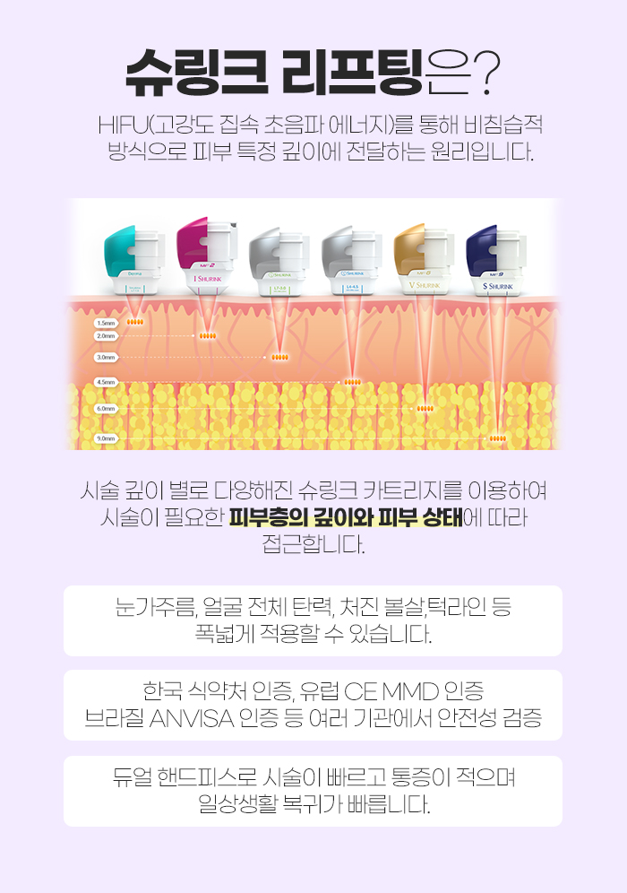 여기서 레이저 리프팅에 대해 먼저 살펴보자면 대표적으로 슈링크 리프팅이 있습니다. 고강도 집속 초음파 에너지를 통해 비침습적인 방식으로 피부 특정 깊이에 전달하는 원리의 시술인데요. 시술 깊이별로 다양한 슈링크 카트리지를 사용해서 시술이 필요한 피부층의 깊이와 피부 상태에 따라 접근하게 된답니다.