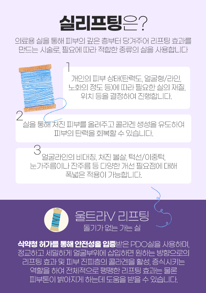 처진 피부를 올려주면서 콜라겐 생성을 유도하고 피부의 탄력을 회복시키는 것을 돕습니다. 또 얼굴 라인의 비대칭과 처진 볼살, 이중턱, 눈가주름, 잔주름 등도 개선을 하는데 도움을 받아보실 수 있습니다. 그렇기에 다른 리프팅 시술도 그렇지만 실리프팅의 경우 시술 경험이 많은 의료진에게 시술을 받도록 해야 하는데요. 그래야 환자분 개개인의 얼굴에 맞게 시술을 받을 수 있기 때문입니다.