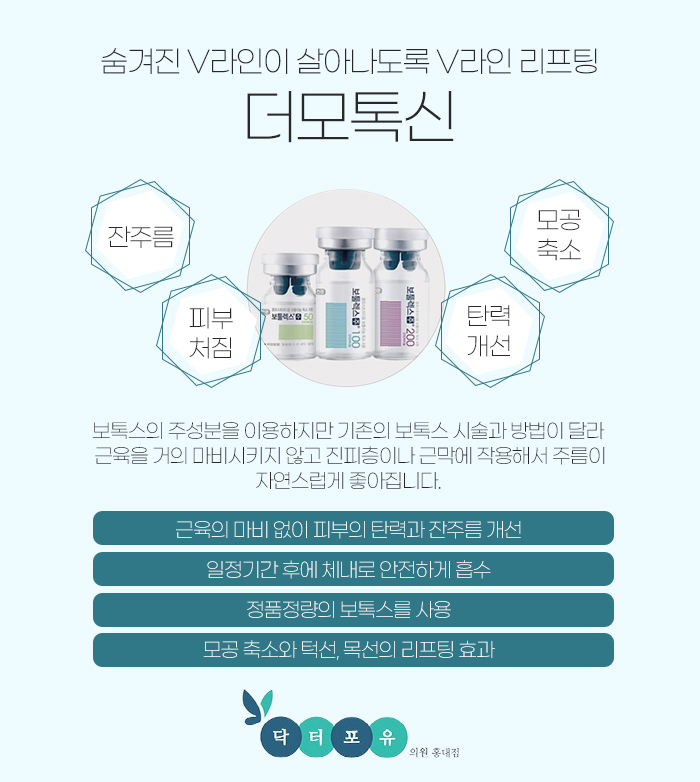 이는 피부층에 직접 보톨리늄 독소를 주입하기 때문인데요. 그래서 미세한 주름을 개선하고 자연스럽게 주름을 사라지게 하는데 도움을 받을 수 있습니다. 또한 얼굴 전체에 자연스럽게 리프팅을 시키고 밝은 피부톤을 만드는데 도움을 주며, 넓어진 모공을 축소하면서 피부톤 개선, 얼굴 라인 개선 등을 기대해 볼 수 있는데요.
