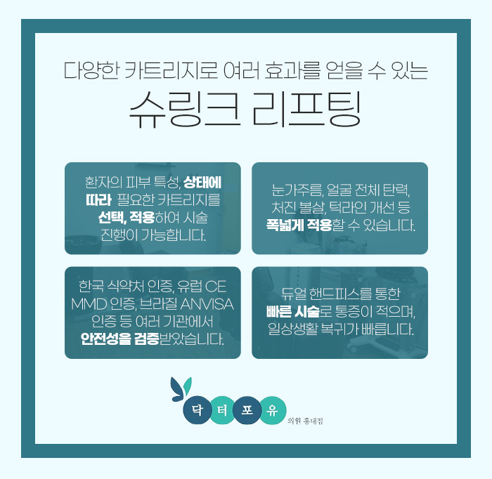 환자분의 피부 특성과 상태에 따라 필요한 카트리지를 선택하고 적용하는 것을 통해 시술을 진행할 수 있답니다. 그리고 눈가 주름과 얼굴 전체의 탄력, 처진 볼살, 턱라인 개선 등 폭넓게 적용을 하는 것이 가능하답니다.