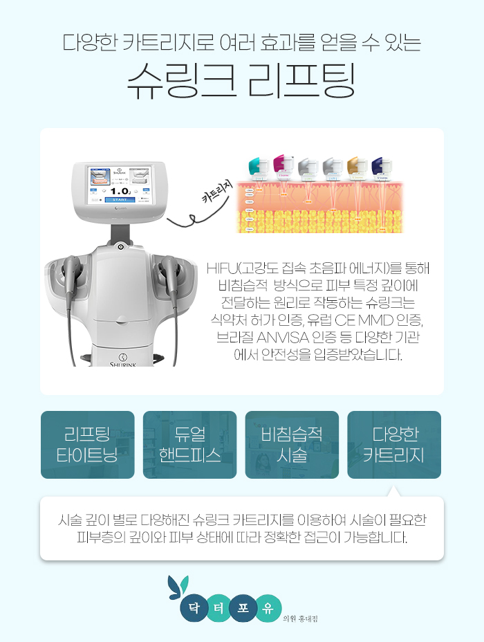 이러한 슈링크는 얼굴 리프팅과 몸 타이트닝 시술을 동시에 적용할 수 있고, 듀얼 핸드피스를 도입했기 때문에 시술받는데 걸리는 시간을 줄일 수 있으며 보다 빠르게 시술을 받아보실 수 있습니다. 또한 비침습적 시술로 진행되는 만큼 시술 시 느껴지는 통증을 최소화시킬 수 있는데요.