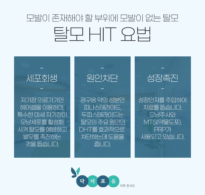 그리고 닥터포유의원에서 합정 탈모 치료를 돕는 대표적인 방법에는 탈모HIT요법이 있는데요.탈모HIT요법은 세포 회생과 원인 차단, 성장 촉진으로 이루어져 있습니다.