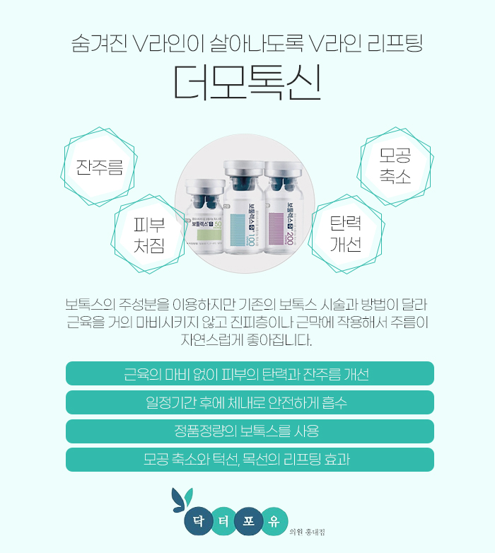 그리고 마포구 리프팅 시술을 받을 때 보톡스 시술을 같이 받으시는 경우가 많습니다. 닥터포유의원에서는 보톡스 시술을 할 때 스킨 보톡스인 더모톡신을 시술하고 있는데요. 더모톡신의 경우 보톡스의 주성분을 이용하고 있지만 기존의 보톡스 시술과 그 방법이 다르답니다. 근육을 거의 마비시키지 않으며, 진피층이나 근막에 작용하여 주름이 자연스럽게 좋아지게 하는데 도움을 줍니다.