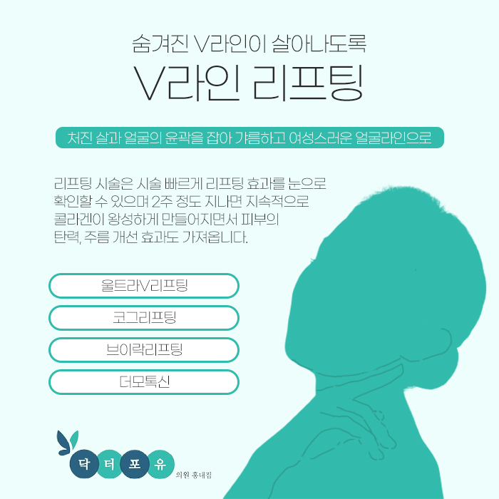 피부의 탄력이 예전 같지 않고 계속 피부가 처지기 시작하여 마포구 리프팅에 대해 알아보고 계신 분들이 많습니다. 이렇게 피부가 계속 처지게 되면 볼 살이 처지고, 또 이중턱이 생기게 되는데요. 이런 경우 닥터포유의원을 찾아주시면 마포구 리프팅을 통해서 이를 개선하는데 도움을 받아보실 수 있답니다.