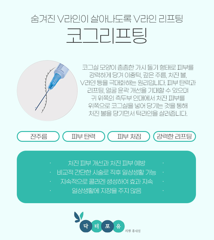또 이러한 코그 리프팅은 피부의 탄력과 리프팅, 얼굴 윤곽 개선을 기대할 수 있는데요. 귀 위쪽의 측두부 인대에서 처진 피부를 위쪽으로 코그실을 넣어 당기는 것을 통해 처진 볼을 당겨 턱라인을 살리는데 도움을 준답니다.