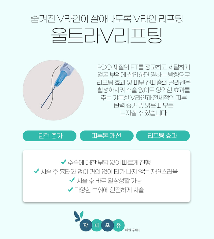 그리고 닥터포유의원에서 진행하는 마포구 리프팅에는 여러 가지가 있는데요. 여기서 울트라V리프팅에 대해 살펴보자면 PDO 재질의 FT를 정교하고 세밀하게 얼굴 부위에 삽입하여 원하는 방향으로 리프팅을 하는 것을 통해 피부의 진피층에 콜라겐 생성을 활성화시킵니다.