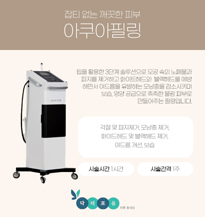 이런 경우 혼자서 서대문 여드름을 치료하기 위해 이런저런 방법을 알아보며 고생을 하시는 경우가 많은데요. 이럴 때 닥터포유의원으로 내원해 주시면 환자분에게 여드름이 발생하게 된 원인에 대해 알아보면서 그에 맞게 치료를 하는데 도움을 받아보실 수 있습니다. 참고로 닥터포유 의원에서는 아쿠아필링과 알라딘필링, PDT, 블랙필, 산소필을 통해서 도움을 드리고 있는데요.