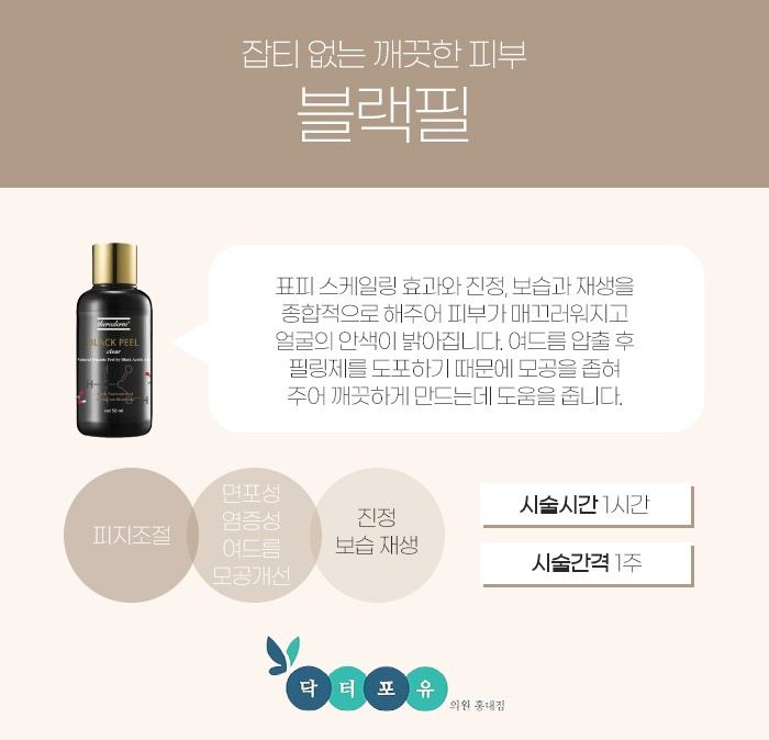 또 블랙필은 표피 스케일링을 도우면서 피부 진정과 보습, 재생을 종합적으로 하는데 도움을 주는데요. 그런 만큼 시술을 받고 난 후에 피부가 매끄러워지는 것은 물론 얼굴의 안색을 밝아지게 만드는데 도움을 줍니다. 그리고 서대문 여드름을 압출하고 나서 필링제를 도포하기 때문에 모공을 좁혀주며 피부를 깨끗하게 만드는데 도움을 준답니다.