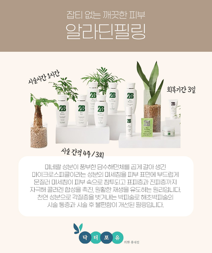 또 알라딘 필링은 기존의 해초 박피술을 받을 때 느껴졌던 통증과 시술을 받고 난 후 느껴졌던 불편함을 개선한 필링이랍니다. 천연 성분으로 각질층을 벗겨내는 박피술인데요. 미네랄 성분이 풍부한 담수 해면체를 곱게 갈아 생긴 마이크로스피큘이라는 성분의 미세침을 이용하고 있답니다.