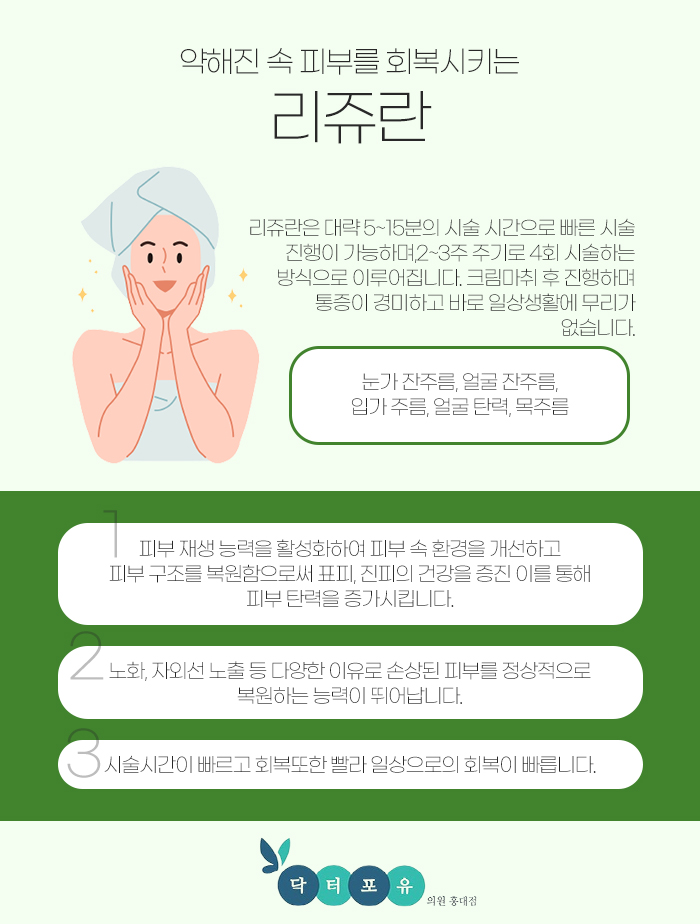 그런 만큼 용산 스킨부스터에 대해 알아보고 계시다면 닥터포유의원으로 내원해주시기 바라는데요. 내원 시 피부 속부터 건강을 회복하는데 도움을 받아보실 수 있습니다.