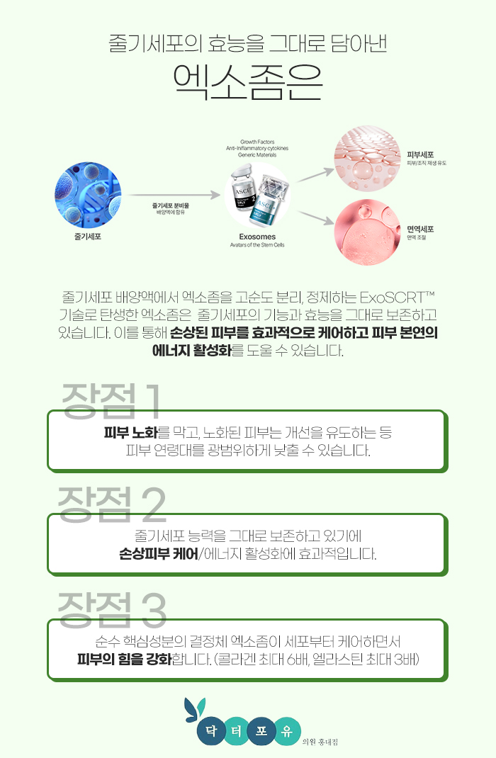 그래서 엑소좀 ASCE+는 피부 장벽을 회복시키고 재생시키는데 도움을 주는 것은 물론 피부의 항염과 안티에이징, 콜라겐 재생에도 도움을 준답니다.
