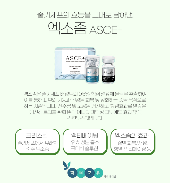그리고 엑소좀은 그 종류가 다양한데요. 닥터포유의원에서는 그 중에서도 ASCE+를 사용하고 있습니다. 이러한 ASCE+에 대해 얘기를 해보자면 줄기세포에서 유래된 순수 엑소좀인 크리스탈과 유효 성분의 흡수를 극대화시킨 솔루션인 액티베이팅이 들어 있답니다. 크리스탈에는 성장인자 5종과 아미노산 18종, 글루타치온 펩타이트 6종 등이 들어있고 액티베이팅에는 고분자 히알루론산과 아미노산, 성장인자 4종 및 미네랄이 들어 있답니다.