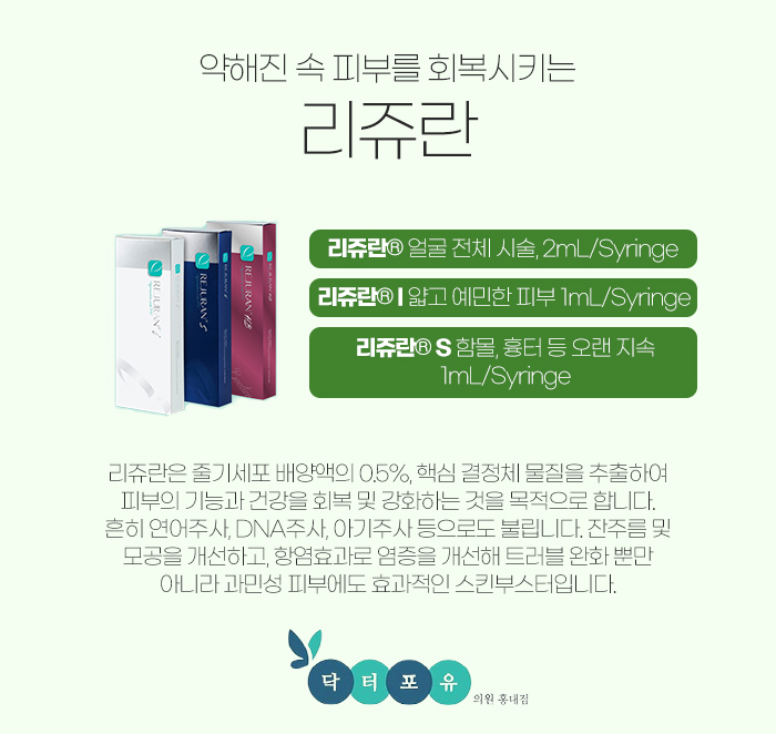 이러한 리쥬란은 리쥬란ⓡ과 리쥬란ⓡI, 리쥬란ⓡS가 있는데요. 리쥬란ⓡ은 얼굴 전체에 시술이 가능하며, 하루 정도의 다음 타임이 괜찮은 분에게 적합합니다. 리쥬란ⓡI는 눈가나 눈밑처럼 얇고 예민한 피부에 빠르게 흡수되며 리쥬란ⓡS는 함몰된 부위나 흉터 등에 좀 더 오래 지속됩니다.