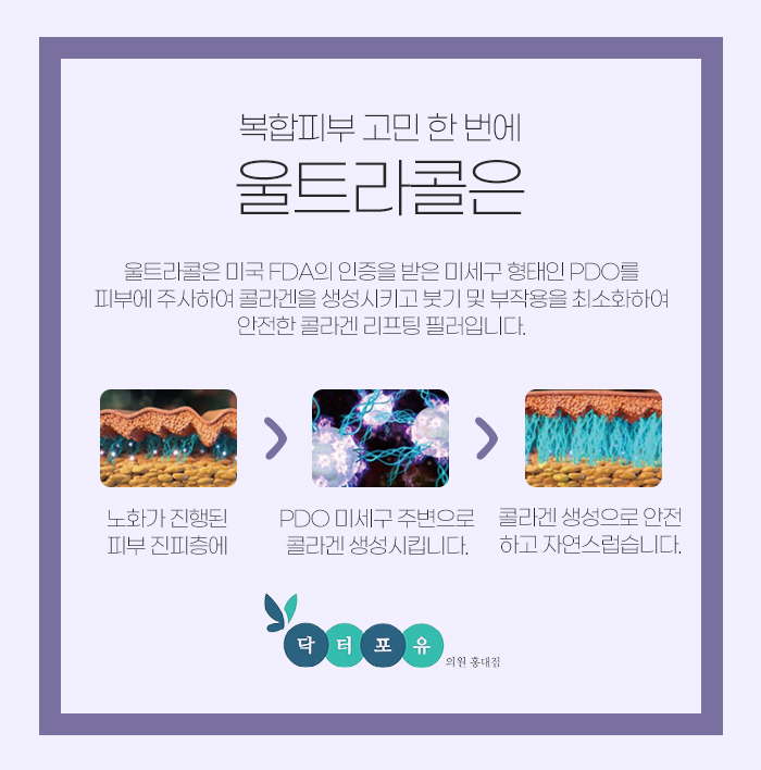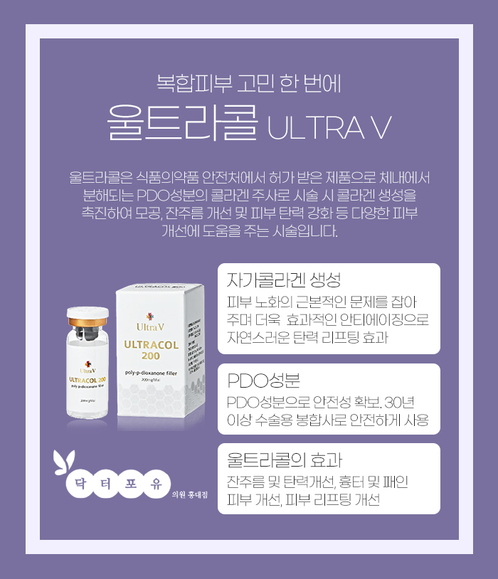 이러한 울트라콜의 PDO는 미세구 형태로 되어 있어서 피부에 주사하게 될 경우 콜라겐을 생성시키고 붓기와 부작용을 최소화하는 콜라겐 리프팅 필러입니다.