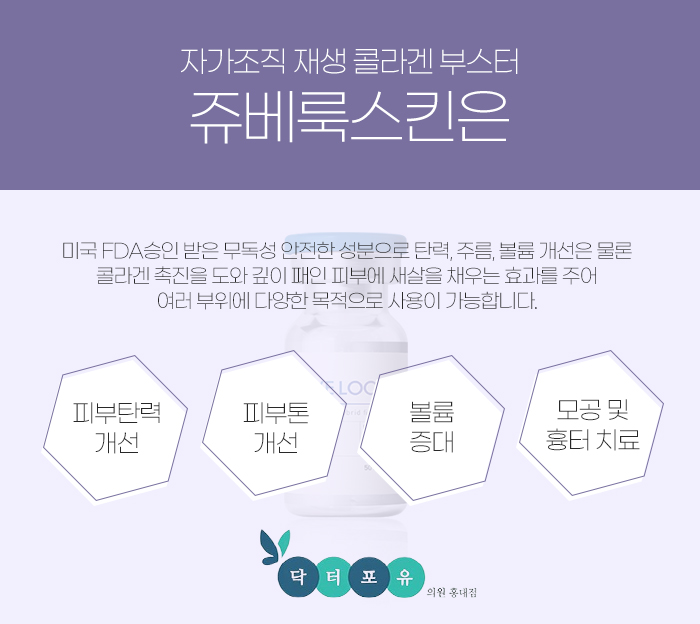 그리고 홍대 주베룩은 미국 FDA에서 승인을 받은 무독성 안정한 성분을 이용하고 있늗네요. 이를 통해 피부의 탄력을 회복시키고 주름을 개선하면서 얼굴에 볼륨감을 주는데 도움을 주는데다 콜라겐의 촉진 또한 도와 깊이 패인 피부에 새살을 채우도록 하여 다양한 부위에 다양한 목적으로 사용이 가능하답니다.