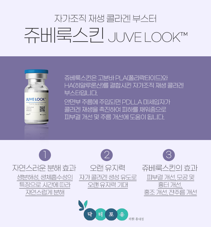 홍대 주베룩에 대해 설명을 해보자면 자가조직 재생 콜라겐 부스터를 말합니다. 고분자 폴리락타이드와 히알루론산을 겹합시킨 것으로, 안면부 주름에 주입하게 될 경우 미세입자가 콜라겐 재생을 촉진시켜서 피하를 채워주게 됩니다. 그래서 피부결 개선과 주름 개선에 도움을 받아보실 수 있는데요.