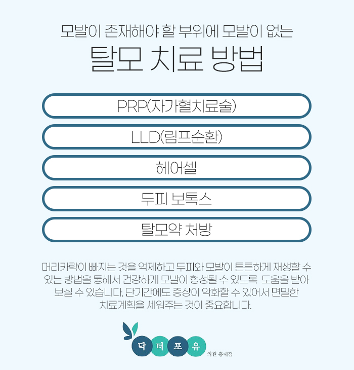 또 닥터포유의원에서는 환자분들이 용산 탈모로 인해 내원해주실 경우 PRP와 LLD, 헤어셀, 두피 보톡스, 탈모약 처방을 통해서 치료를 하는데 도움을 드리고 있습니다. 이로 하여금 머리카락이 빠지는 것을 억제하면서 두피와 모발이 튼튼하게 재생될 수 있게 돕늗네요. 그래서 건강한 모발을 형성하는데 도움을 받으실 수 있답니다. 그리고 단기간에도 증상이 악화될 수 있기 때문에 면밀한 치료 계획을 세우도록 해야 하는데요.