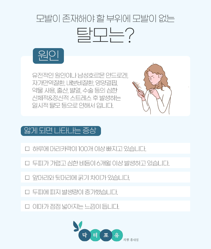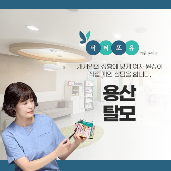 그런 만큼 용산 탈모 때문에 시름에 잠겨 계시다면 닥터포유의원으로 내원하셔서 상담 및 진단부터 받아보시기 바라는데요. 자신에게 맞는 적합한 관리 방법 및 치료 방법을 통해서 두피 건강과 모발 건강을 회복하는데 도움을 받아보실 수 있답니다.