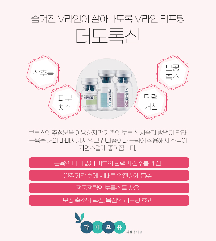그리고 닥터포유의원에서는 홍대 보톡스로 더모톡신을 사용하고 있습니다. 이러한 더모톡신은 보톡스의 주 성분을 이용하고 있지만 기존의 보톡스 시술과는 다르게 근육을 거의 마비시키지 않고 진피층이나 근막에 작용해서 주름이 자연스럽게 좋아질 수 있도록 돕는데요. 이는 피부층에 직접 보툴리늄 독소를 주입하고 있어서입니다.
