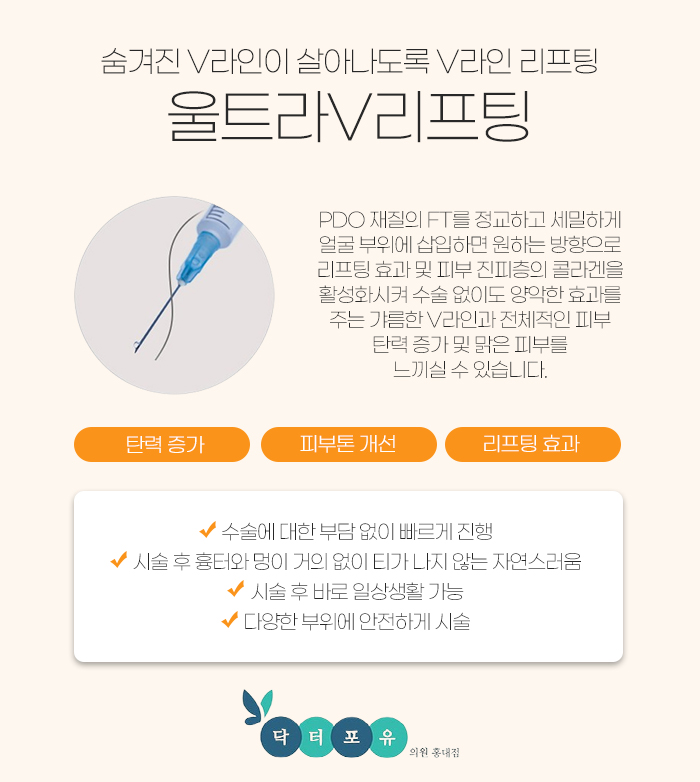 이러한 홍대 리프팅에는 여러 가지가 있는데요. 그 중에서도 울트라V리프팅에 대해 얘기해보자면 PDO 재질의 FT를 정교하고 세밀하게 얼굴 부위에 삽입하는 시술을 말합니다. 원하는 방향으로 리프팅을 해주면서 피부 진피층의 콜라겐을 활성화시키는 것을 통해 수술을 하지 않아도 양악을 한 것처럼 갸름한 V라인을 만드는데 도움을 받으실 수 있는데요. 전체적인 피부 탄력을 증가시키면서 맑은 피부를 갖게 하는데 도움을 준답니다.