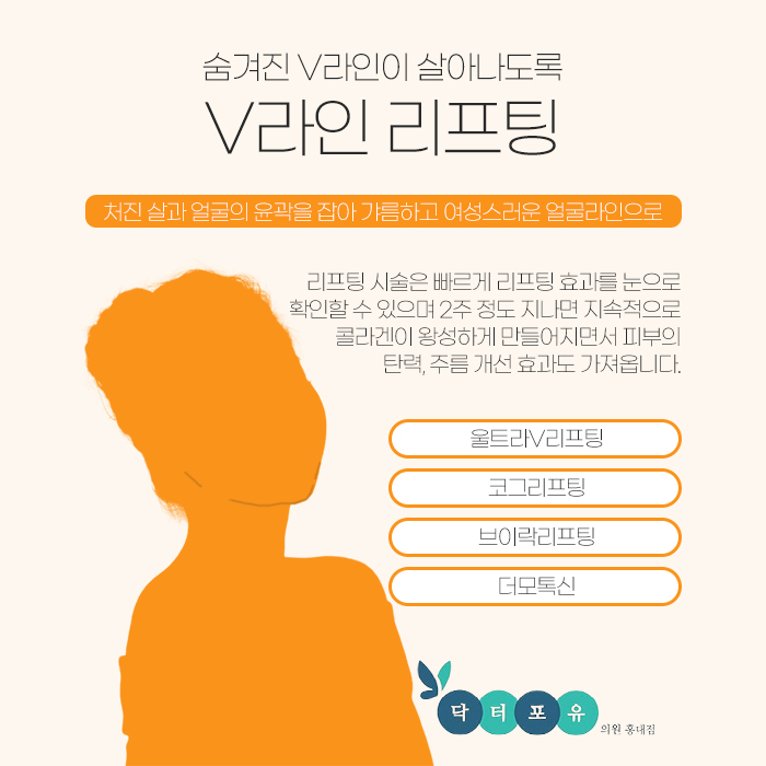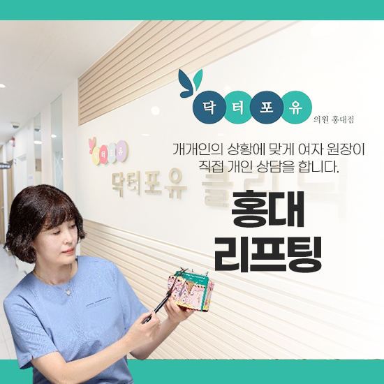 그렇다면 닥터포유의원으로 내원하셔서 홍대 리프팅을 받아보시기 바라겠습니다. 이는 닥터포유의원에서 숙련된 의료진이 환자분의 피부 탄력도와 피부가 노화된 정도, 얼굴형 등 여러 가지 변수를 고려해서 시술을 진행하고 있는 곳이기 때문입니다.