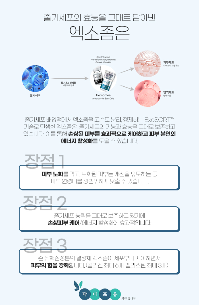 그리고 서대문 스킨부스터 엑소좀은 줄기세포 배양액에서 엑소좀을 고순도 분리 및 정제하는 기술로 탄생되었는데요. 그래서 줄기세포의 기능과 효능을 그대로 보존하고 있답니다. 그런 만큼 손상을 입은 피부를 효과적으로 케어하는데 도움을 받아보실 수 있고, 피부 본연의 에너지를 활성화시키는 데도 도움을 받아보실 수 있답니다.
