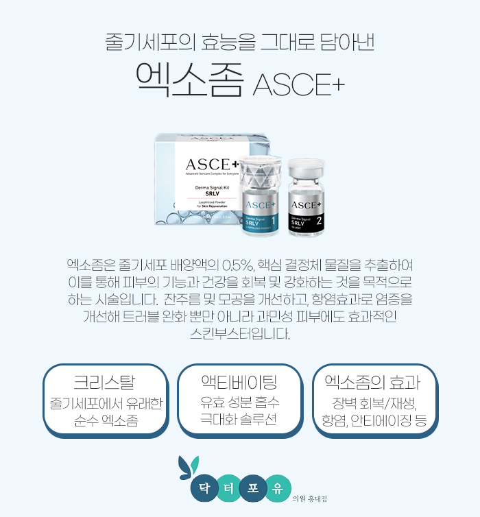 닥터포유의원에서는 이러한 엑소좀 중에서도 ASCE+를 사용하고 있습니다. ASCE+는 줄기세포에서 유래한 순수 엑소좀인 크리스탈과 유효 성분 흡수를 극대화시킨 솔루션인 액티베이팅에 들어있는데요.