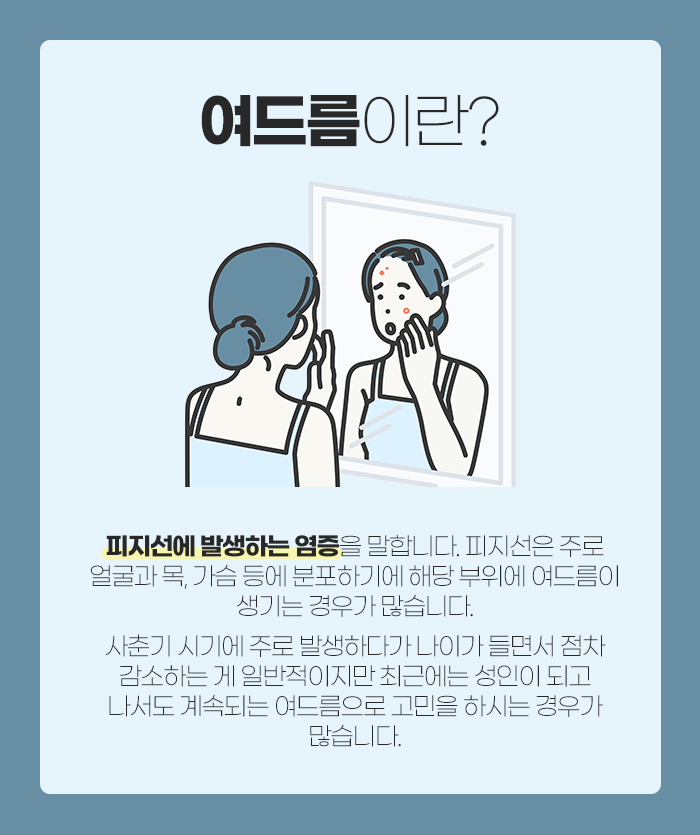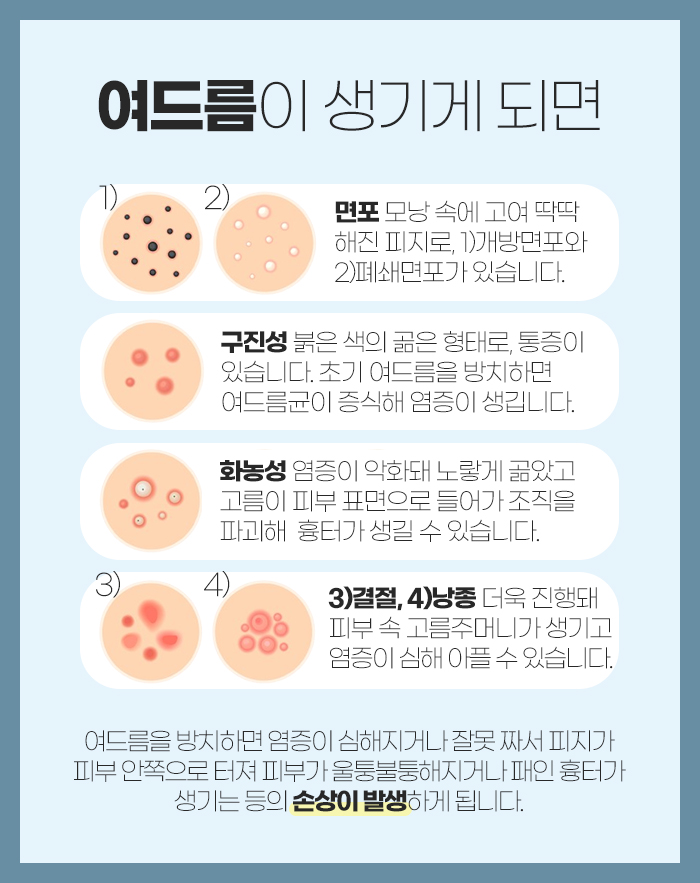 특히 여드름을 함부로 짜다가 악화되는 경우가 많은데요. 이로 인해 염증을 유발할 수 있고, 흉터가 남기 쉽습니다.