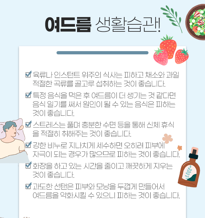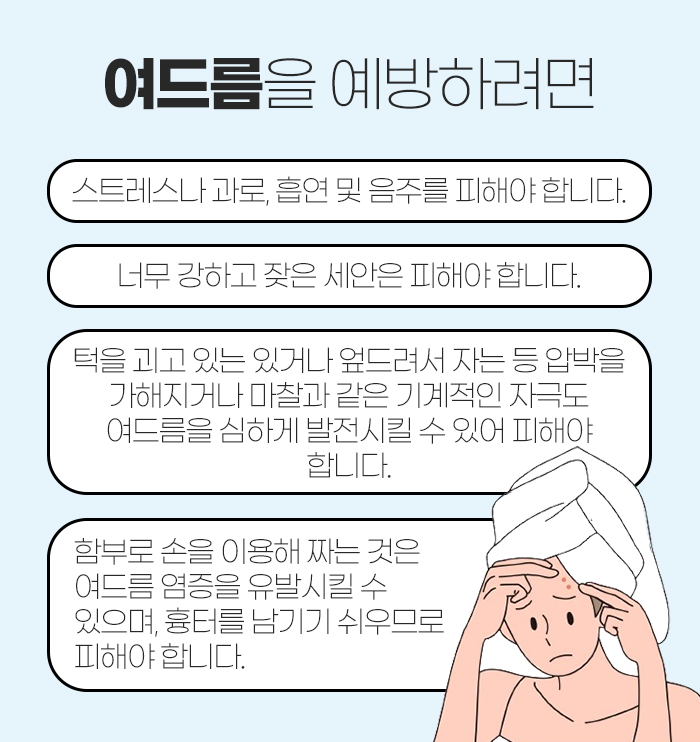 ㅁ 턱을 괴고 있거나 엎드려 자는 등 압박이 가해지거나 마찰 등은 여드름을 심하게 발전시킬 수 있으니 피해야 합니다.